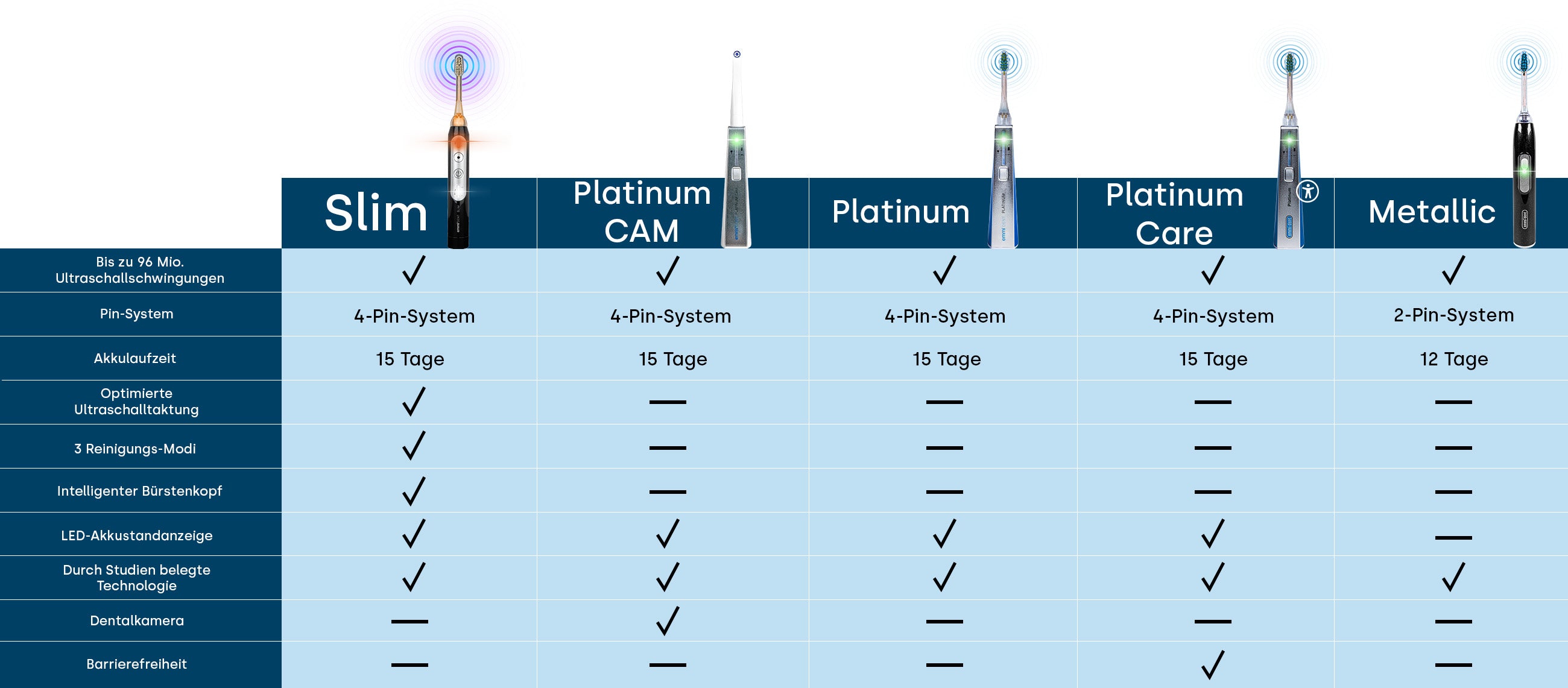 Die Modelle unterscheiden sich vor allem in Funktionen, Ausstattung und Bedienkomfort. Während einige Varianten auf maximale Einfachheit setzen, bieten andere zusätzliche Features wie mehrere Reinigungsmodi, eine integrierte Dentalkamera oder spezielle Komfortfunktionen.