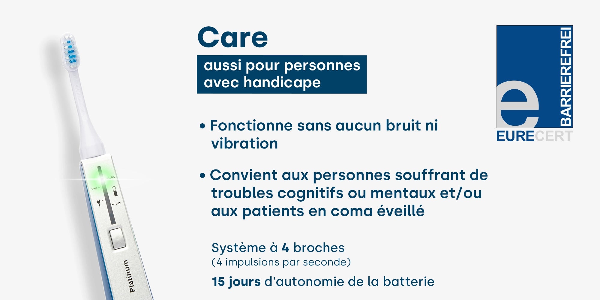 Le modèle Care , quant à lui, est conçu comme une brosse à dents à ultrasons sans obstacle qui fonctionne totalement sans bruit ni vibrations. Il est donc idéal pour les personnes souffrant de troubles cognitifs ou pour les patients en état végétatif. Avec le système à 4 broches (quatre impulsions par seconde) et une autonomie de batterie de 15 jours, il établit de nouvelles normes en matière de soins et d'assistance.