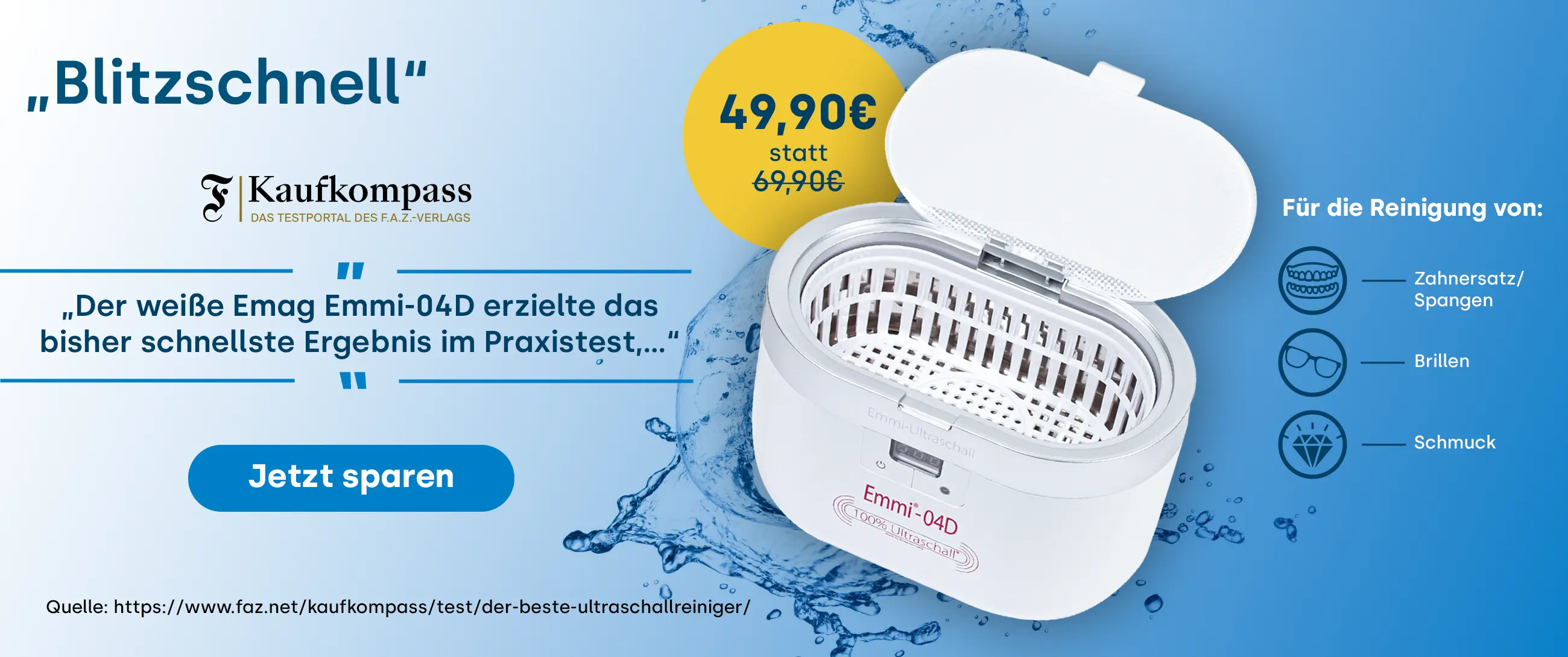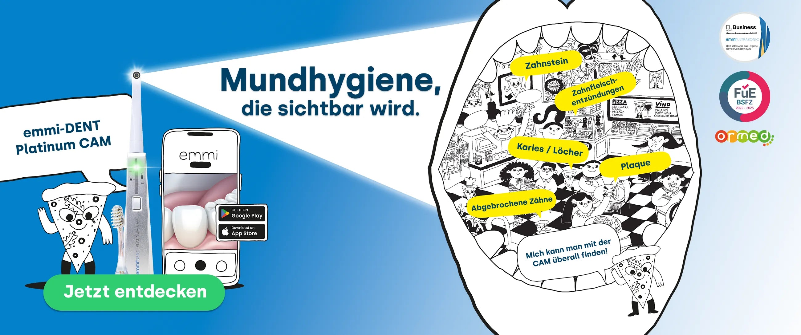 Die Ultraschallzahnbürste von emmi-dent bietet mit ausgefeilter Technik ein neues Wirkungsprinzip und damit maximalen Nutzen. Herkömmliche Reinigungsverfahren wie die Zahnputztechnik mit einer Hand- oder anderen elektrischen Zahnbürsten arbeiten mit Makroreinigung. Mit mechanischen Bewegungen erreicht ein Anwender 20.000 bis 40.000 Schwingungen pro Minute. Im Unterschied dazu steht die neuartige, bewegungs- und nahezu berührungsfreie Ultraschalltechnologie der emmi-dent. Mit diesem Mikroreinigungsverfahren werden bis zu 96 Mio. Schwingungen pro Minute erreicht. Die emmi-dent reinigt auch die schwer erreichbaren Stellen im Mund professionell und gründlich. Die Ultraschallwellen dringen bis in die kleinsten Zwischenräume vor – und dies sogar bei Zahnspangen und Implantaten. Wissenschaftliche Studien (Ormed® - Universität Witten/Herdecke) bestätigen, dass dieemmi-denterfolgreich gegen Zahnplaque, Parodontitis, Gingivitis (Zahnfleischentzündung) sowie für die parodontale Erhaltungstherapie angewendet werden kann. Und das ohne jegliche Bürstbewegungen.
