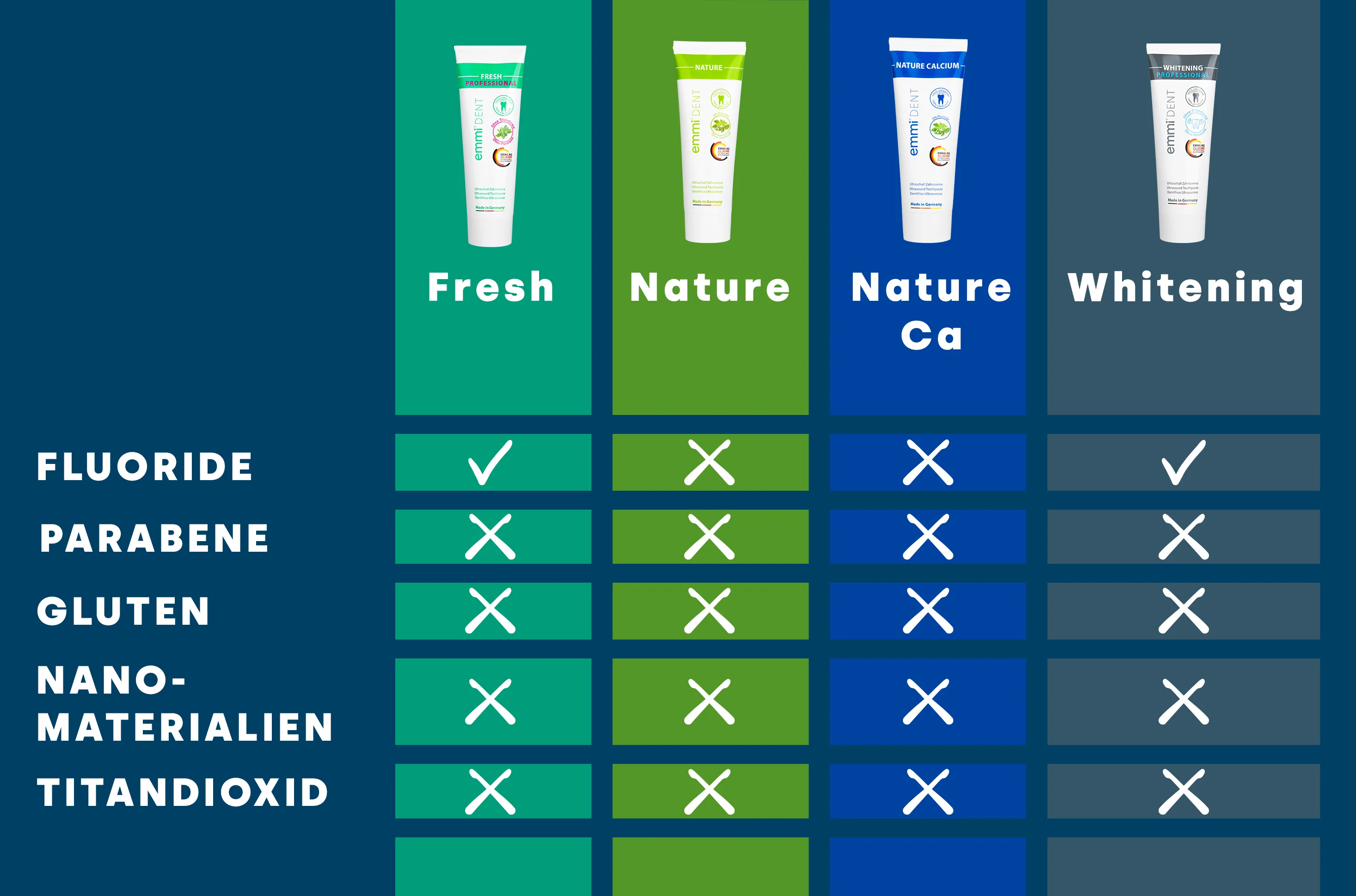 Ähnlich wie emmi-dent Nature liegt auch die Nature Calcium Zahnpasta innerhalb des RDA-Bereichs von 40 bis 60. Zusätzlich enthält sie Kalzium zur Unterstützung der Remineralisierung der Zähne. Diese Zahnpasta ist fluoridfrei und enthält einen milden Mentholgeschmack für ein erfrischendes Erlebnis.