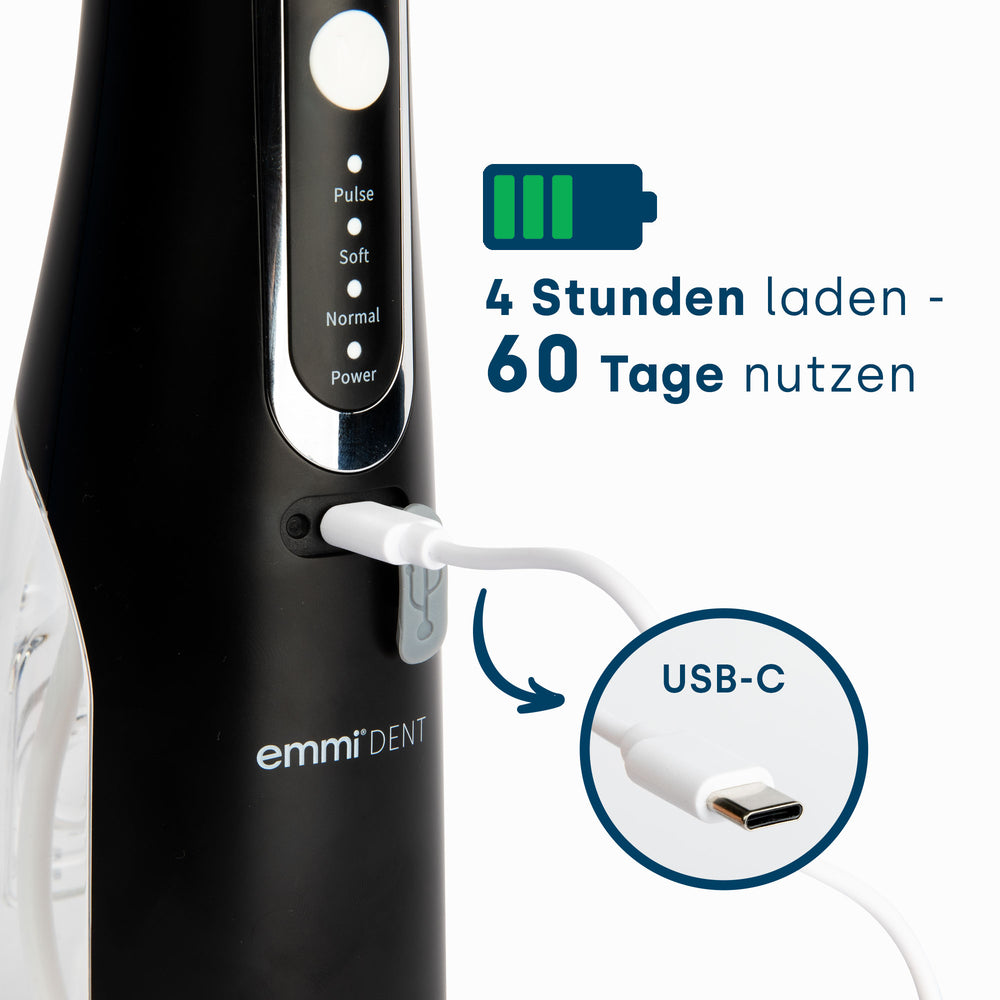 Mundduschen gibt es in diversen Ausführungen, von Modellen, die direkt an den Wasserhahn angeschlossen werden und somit die Bewegungsfreiheit durch einen Wasserschlauch einschränken, bis hin zu stationären Mundduschen mit einem externen Wassertank, die ebenfalls in ihrer Handhabung limitiert sind. emmi-dent hat diese Herausforderungen erkannt und eine innovative Lösung entwickelt: eine praktische, unkomplizierte und wirksame Munddusche. Die emmi-dent elektrische Munddusche zeichnet sich durch ihre kabellose Konstruktion aus, die uneingeschränkte Beweglichkeit im gesamten Mundraum ermöglicht. Ausgestattet mit einem großzügigen Wassertank und einem integrierten Akku, bietet sie maximale Handlichkeit ohne störende Kabel oder Schläuche. Einfach den Tank mit Wasser füllen und den Akku aufladen – schon ist das Gerät startklar. Zudem ist die emmi-dent Munddusche aufgrund ihrer kompakten Größe der ideale Begleiter auf Reisen. Die Vorteile der emmi-dent Munddusche: - Kabellos für uneingeschränkte Bewegungsfreiheit - Kompaktes Design, perfekt für unterwegs - 300 ml Wassertank im Handstück für einfaches Nachfüllen - Unkompliziertes Aufladen des Akkus mit USB-C (4 Stunden laden, 60 Tage nutzen) Wenn Sie auf der Suche nach einem Produkt sind, das nahtlos zu Ihrem Lebensstil und Ihren Ansprüchen an eine sorgfältige Zahnpflege passt, bietet die emmi-dent Munddusche eine maßgeschneiderte Lösung. Entwickelt für Anwender, die sowohl beim Start in den Tag als auch beim Ausklang am Abend Wert auf eine gründliche und entspannte Mundhygiene legen, setzt sie neue Maßstäbe in der Zahnreinigung.