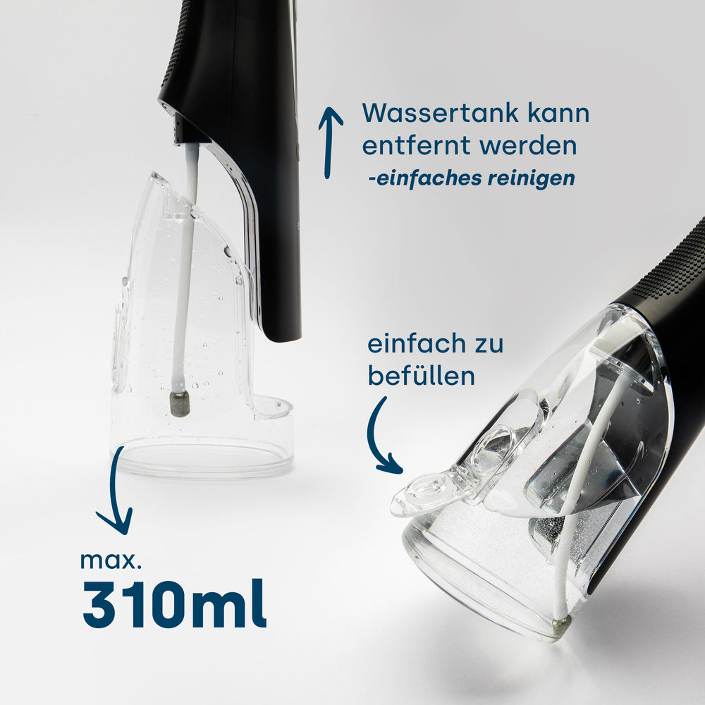 Die Munddusche ist wasserdicht nach IPX7 und kann zu Hause oder auf Reisen verwendet werden. Der integrierte 300 ml Tank kann zum Reinigen einfach abgenommen werden. Die Düse lässt sich ebenfalls bequem abnehmen zum Austauschen der Aufsätze.
