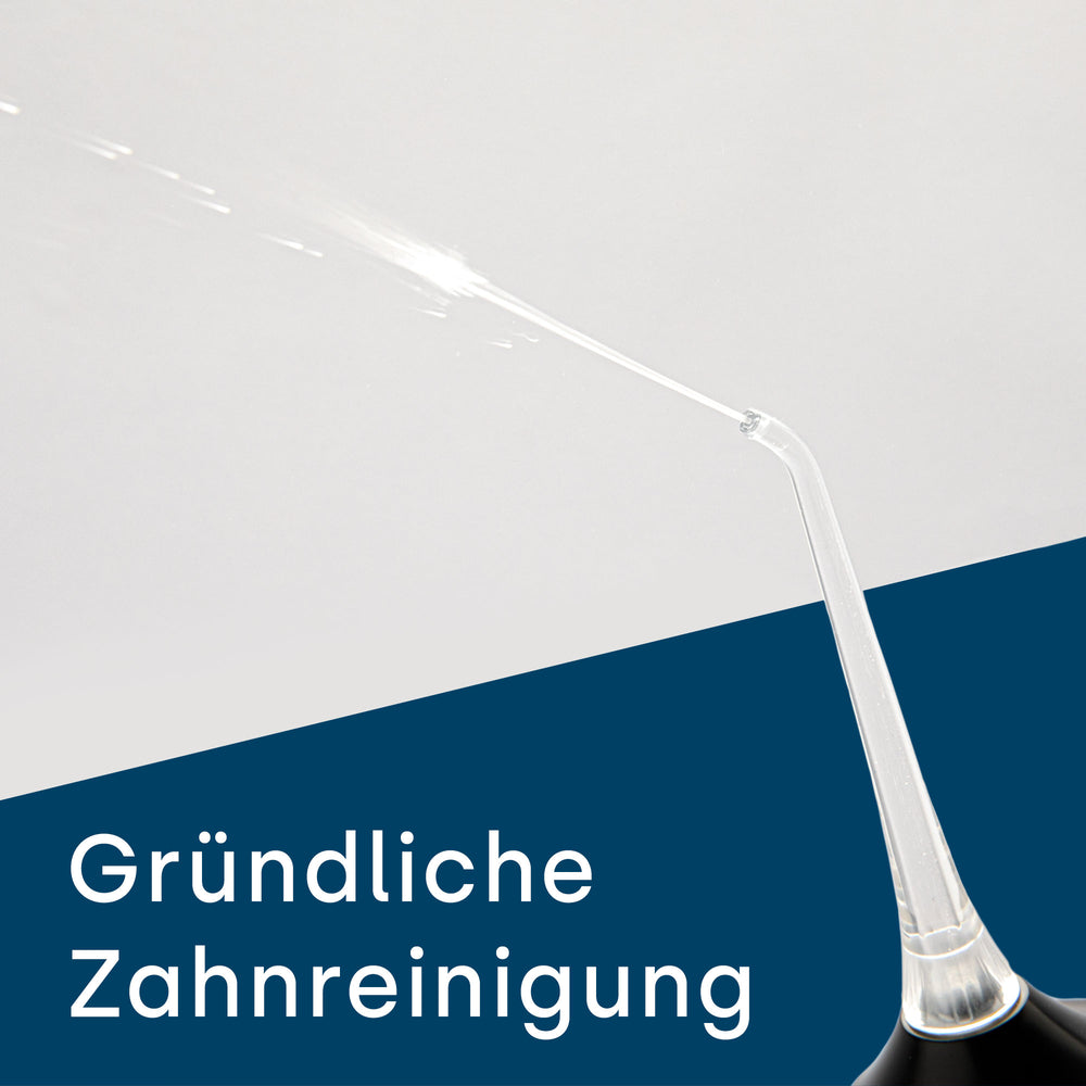 Wissenschaftliche Untersuchungen haben gezeigt: Einfaches Zähneputzen mit einer Zahnbürste ist oft nicht ausreichend, um eine optimale Mundhygiene zu erzielen. Aus diesem Grund haben wir eine effiziente und mobile Munddusche konzipiert, die selbst schwer erreichbare Stellen im Mund von Speiseresten und groben Belägen befreit. Dank des integrierten Akkus ist das Gerät kabellos, ideal für unterwegs und bietet somit einen erheblichen Vorteil gegenüber einer stationären Munddusche. Unsere Munddusche AQUADENT stellt eine hervorragende Alternative zur herkömmlichen Zahnseide dar und trägt zu einem gesunden Zahnfleisch bei.