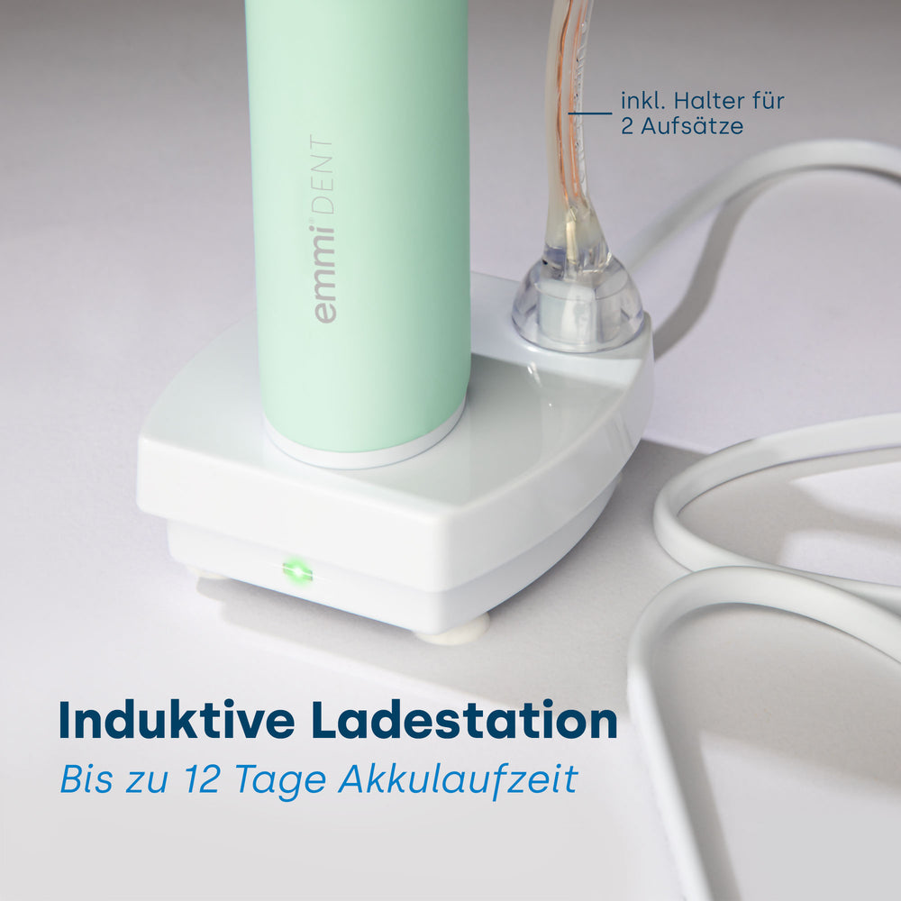 Die emmi-dent Metallic verfügt über eine optimale Batterielebensdauer. Bei regelmäßigem Gebrauch von 2–3-mal pro Tag kann die Metallic bis zu 12 Tage durchhalten, bevor sie wieder aufgeladen werden muss. Diese verlängerte Akkulaufzeit (Lithium-Ionen) bietet Komfort und ununterbrochene Nutzung und macht ein häufiges Aufladen überflüssig.