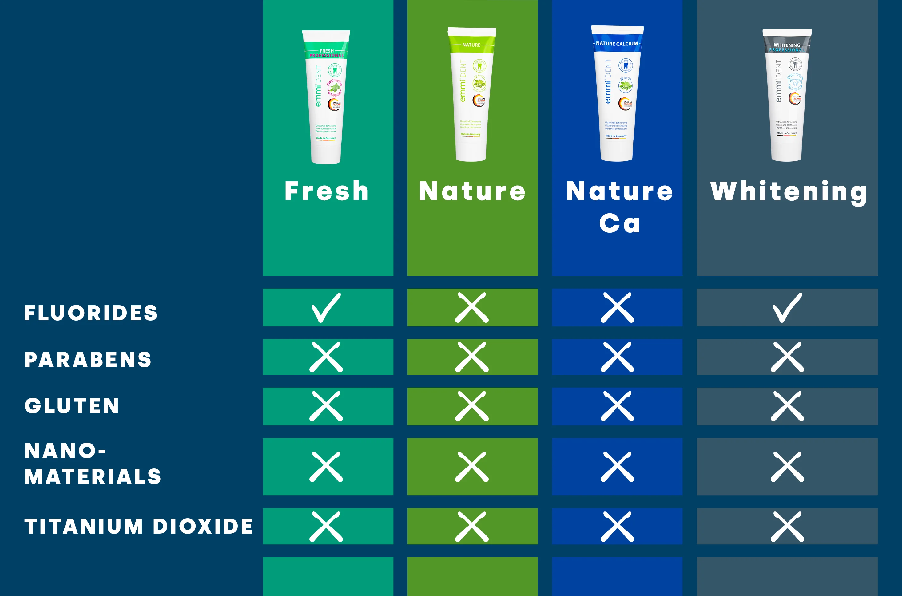Both toothpastes are the result of extensive tests and research and represent gentle but effective dental care. Try our Whitening toothpaste without titanium dioxide or our Fresh toothpaste without titanium dioxide and experience bright, healthy teeth.