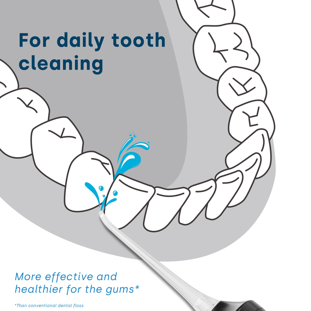 Scientific studies have shown that simply brushing your teeth with a toothbrush is often not enough to achieve optimal oral hygiene. For this reason, we have designed an efficient and mobile oral irrigator that removes food residue and coarse deposits from even the hard-to-reach areas of the mouth. Thanks to the integrated battery, the device is cordless, ideal for on the go and therefore offers a significant advantage over a stationary oral irrigator. Our AQUADENT oral irrigator is an excellent alternative to conventional dental floss and contributes to healthy gums.