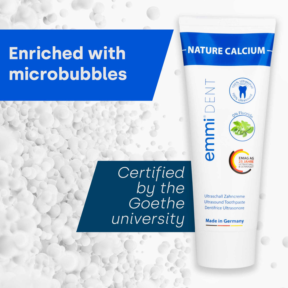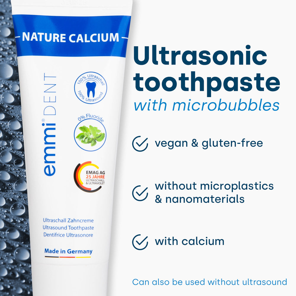 Experience natural and fluoride-free dental care with emmi-dent Nature Calcium Ultrasonic Toothpaste, which not only gently cleans your teeth but also strengthens them with valuable calcium. This product description presents the outstanding features and advantages of this unique toothpaste: