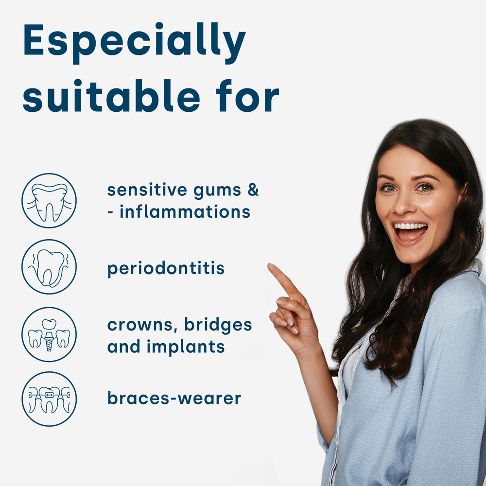 The fine ultrasonic vibrations penetrate deep into the spaces between teeth and the gums, removing bacteria even in hard-to-reach places and thus effectively preventing tooth decay, plaque and inflammation. With regular use, the reduction of gingivitis and periodontitis can be actively promoted.