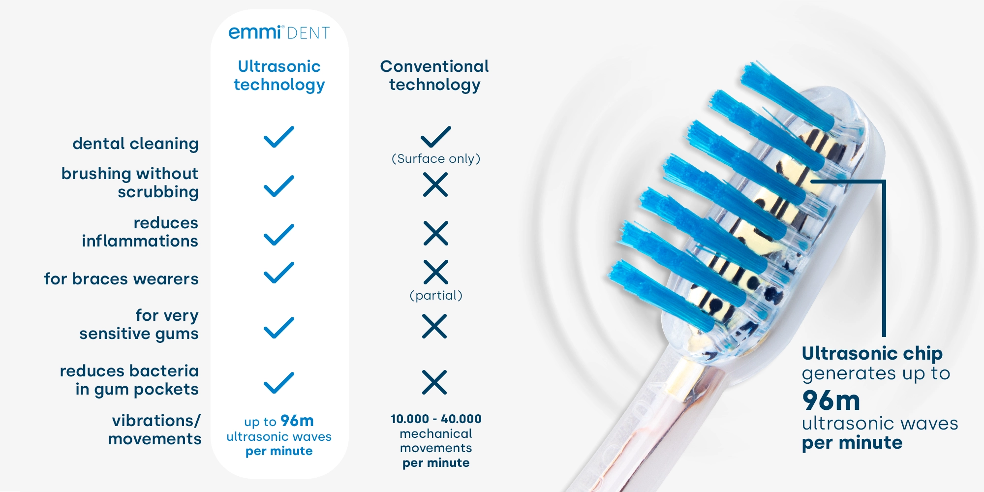 Ultrasound technology has proven itself in professional tooth cleaning at the dentist. It uses a "hard" ultrasound with a low frequency and high power. Dentists have been using the method successfully for many years to remove tartar and other contaminants. The ultrasonic toothbrush also enables daily use of ultrasonic technology at home. The innovative emmi-dent uses a "soft" ultrasound with a high frequency and low power.