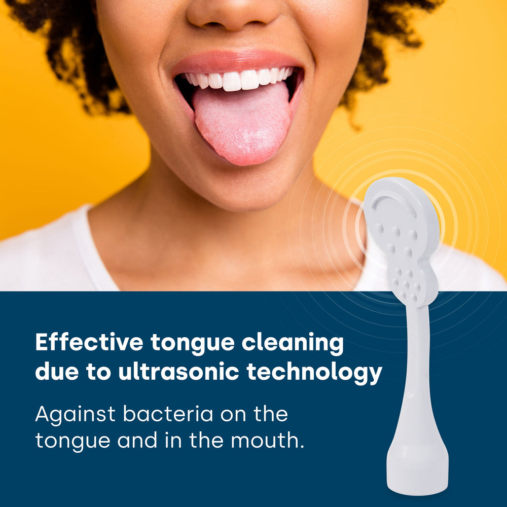 With the help of the emmi-dent Tongue cleaner can reduce bacteria through ultrasound. To use, the tongue cleaner is placed on the emmi-dent Toothbrush attached.