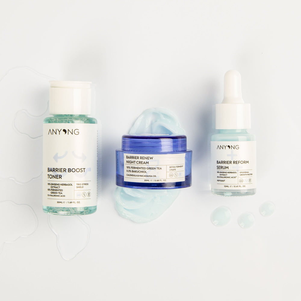 El kit perfecto para reparar la barrera cutánea. El tónico reafirmante con ginseng y ácido hialurónico aporta a tu piel hidratación y vitaminas, lo que lo convierte en el juego previo ideal. Lo más destacado de tu tratamiento reparador es el sérum de ácido hialurónico, que ayuda a rejuvenecer tu piel con su limpieza profunda. El toque final acogedor es la crema de noche, que favorece la renovación de las células de la piel.