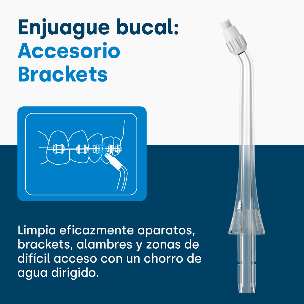 Adecuado para limpiar aparatos ortopédicos u otros dispositivos dentales. El accesorio está diseñado para eliminar bacterias ocultas, acumulaciones, así como suciedad blanda y residuos de comida. Adecuado para el cuidado dental diario.