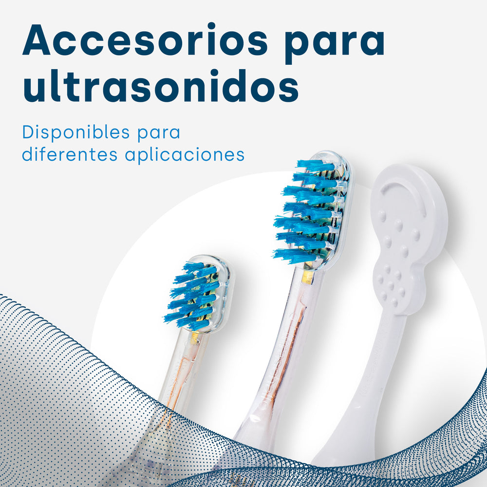 El emmi-dent Platinum es un innovador cepillo de dientes ultrasónico que utiliza tecnología ultrasónica patentada para una higiene bucal eficaz y suave. Si bien el emmi-dent Platinum es en sí mismo un sistema completo, ofrece una gama de accesorios que pueden ampliar su funcionalidad y satisfacer necesidades dentales específicas. El accesorio ultrasónico es un componente clave del sistema emmi-dent Platinum. Emite ondas ultrasónicas que hacen que las microburbujas de la pasta de dientes colapsen, permitiendo un proceso de limpieza profunda y suave. Este accesorio es imprescindible para utilizar la tecnología ultrasónica del cepillo de dientes.