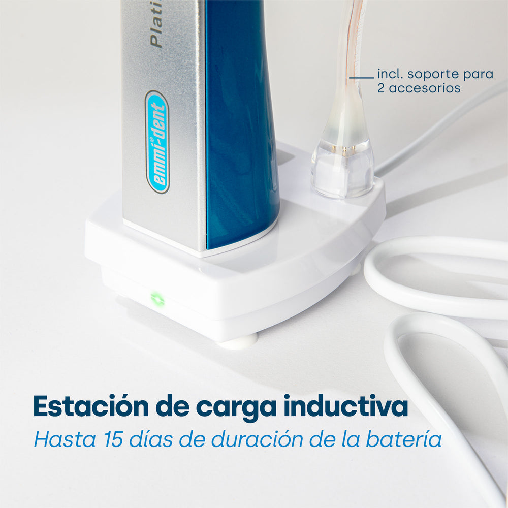 El emmi-dent Platinum tiene una batería de mayor duración que sus modelos predecesores. Con un uso regular de 2 a 3 veces al día, el Platinum puede durar hasta 15 días antes de necesitar recargarse. Esta batería de larga duración (iones de litio) ofrece comodidad y uso ininterrumpido y elimina la necesidad de cargas frecuentes.