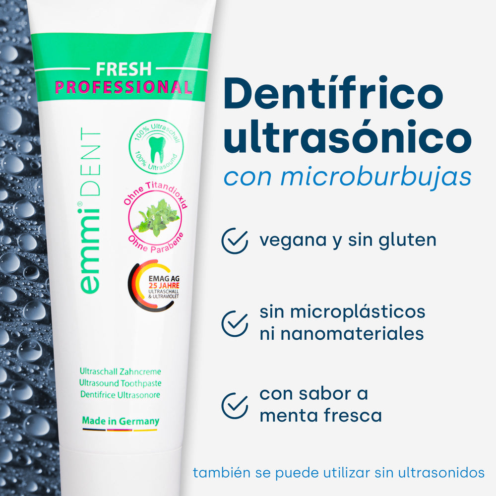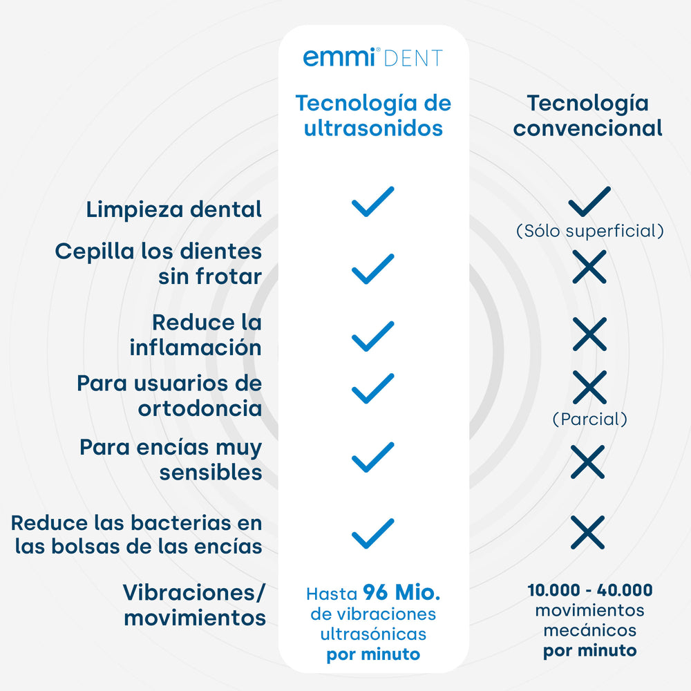 Los cabezales de cepillo ultrasónico de emmi-dent contienen el chip piezoeléctrico patentado, que genera hasta 96 millones de vibraciones por minuto. Estas vibraciones, combinadas con la pasta de dientes ultrasónica especial emmi-dent, se transmiten directamente a los dientes y a la cavidad bucal. Allí, las pequeñas burbujas limpiadoras actúan reduciendo eficazmente las bacterias, la placa y el sarro dental, contribuyendo así a un excelente rendimiento de limpieza.