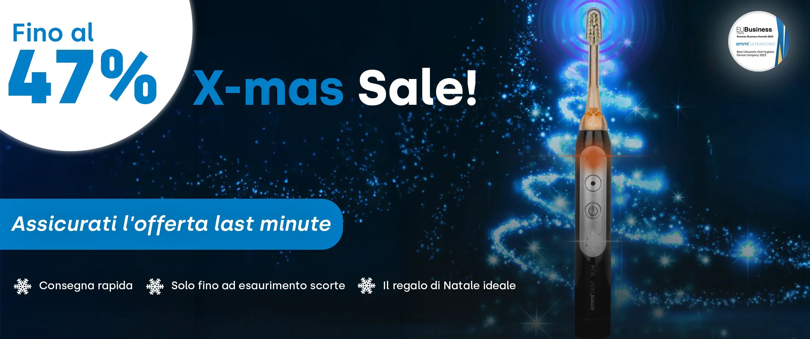 Con lo spazzolino a ultrasuoni Emmi-Dent puoi combattere parodontite, gengivite e afte. La sua efficacia è stata dimostrata in diversi studi . Lavarsi i denti due volte al giorno riduce significativamente il numero di batteri in bocca. Come ulteriore vantaggio, garantisce anche un alito fresco a lungo. Lo spazzolino a ultrasuoni è facile da usare, il che lo rende particolarmente adatto a bambini e persone con difficoltà motorie. Anche chi porta apparecchi ortodontici, ponti, impianti o corone può finalmente tirare un sospiro di sollievo, poiché la tecnologia a ultrasuoni pulisce in modo affidabile anche gli spazi più piccoli. Inoltre, questo spazzolino, utilizzato con uno speciale dentifricio a ultrasuoni , ripristina gradualmente il colore naturale dei denti. Anche le macchie più piccole causate da caffè, tè, vino o nicotina vengono rimosse, restituendoti un sorriso bianco.
