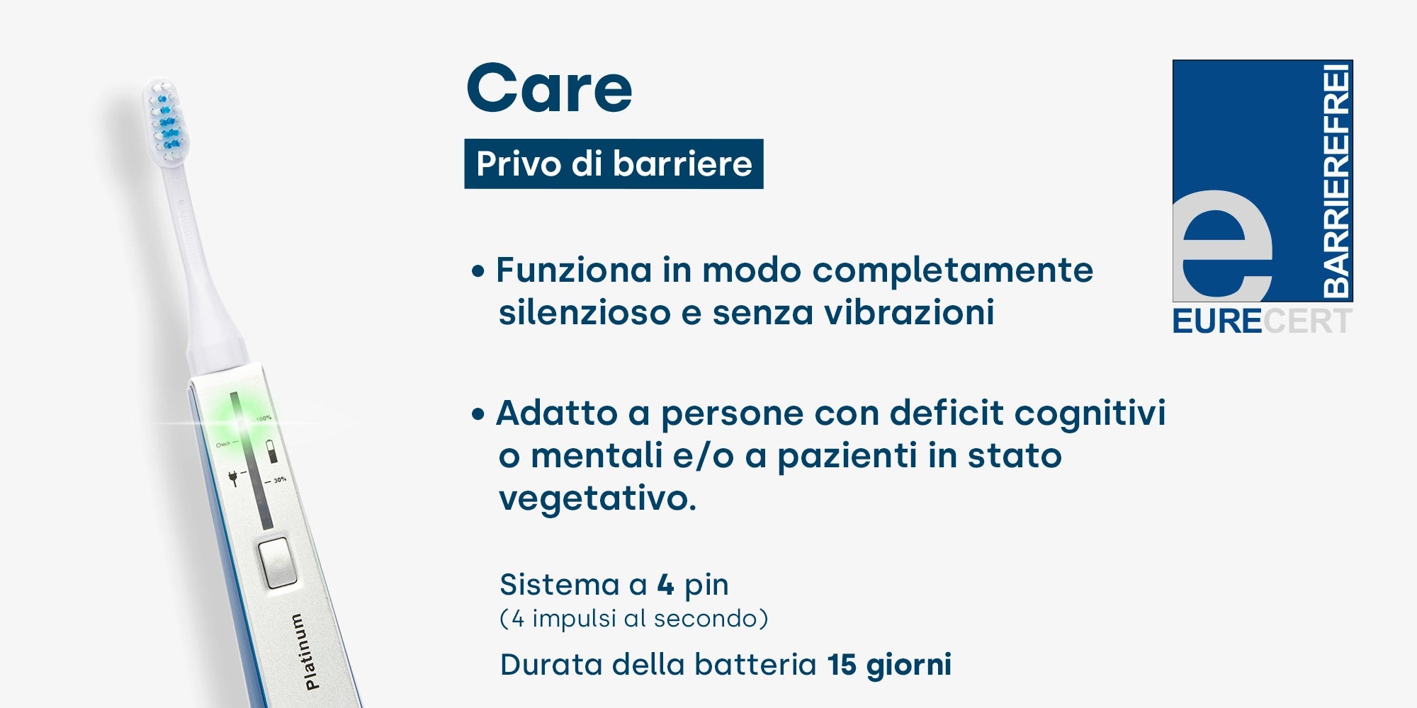 Lo spazzolino ad ultrasuoni emmi-dent Platinum Care non è solo un altro modello della nostra famiglia di spazzolini emmi-dent, bensì l'ulteriore sviluppo efficiente del nostro spazzolino ad ultrasuoni "Platinum"; adattato alle esigenze delle persone con mobilità ridotta. Il nostro spazzolino ad ultrasuoni “Platinum Care” promette uno spazzolamento dei denti rivoluzionario grazie al sigillo di qualità che gli è stato conferito per l’accessibilità .