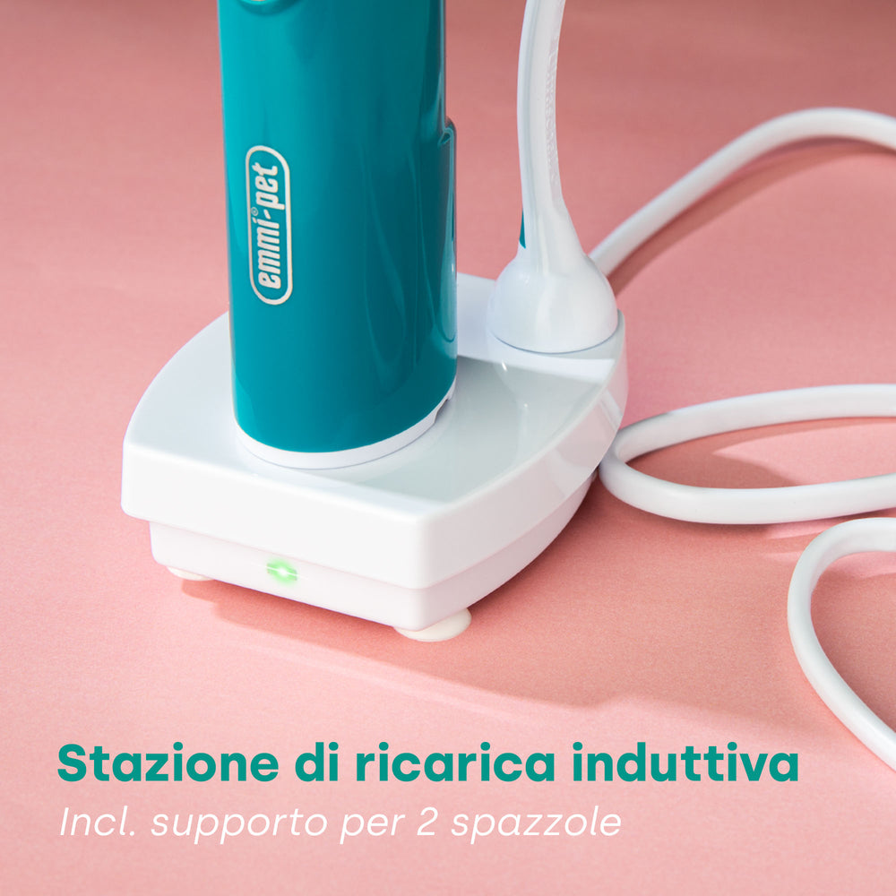 L'offerta comprende lo spazzolino ultrasonico emmi-pet , una stazione di ricarica, due testine per spazzolino ultrasonico emmi-pet ( 1 grande / 1 piccola ) e il dentifricio ultrasonico emmi-pet per animali .