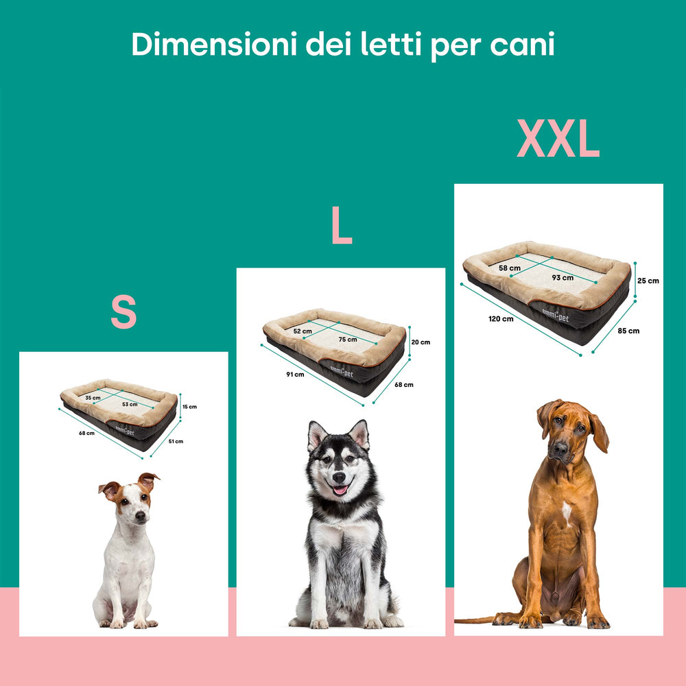 Il letto ortopedico per cani emmi-pet è disponibile in tre misure, così che sia i cani di piccola che di grande taglia possano trovare il posto perfetto. Le dimensioni esatte sono: