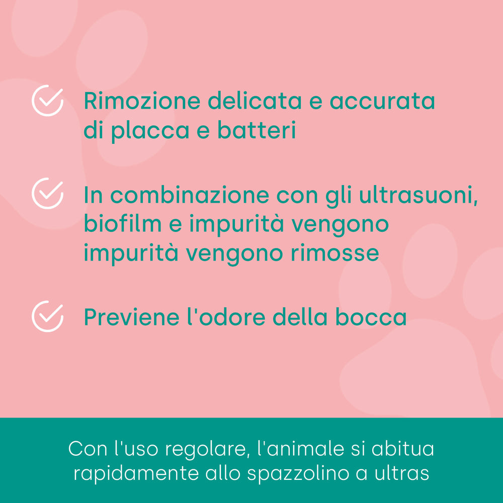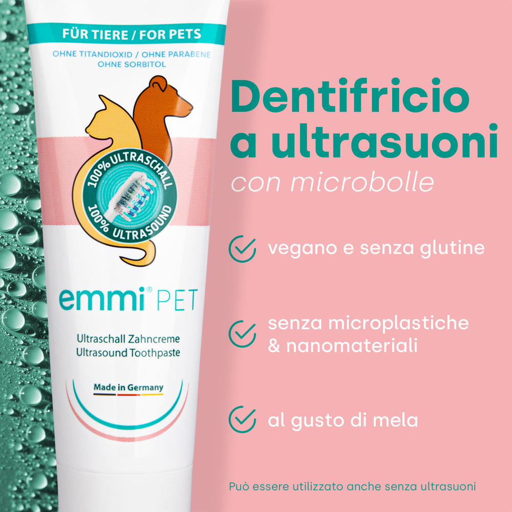 Il dentifricio ultrasonico emmi-pet per animali offre numerosi vantaggi che lo rendono un'ottima scelta per la cura dentale del tuo animale domestico: Pulizia delicata senza abrasione: grazie agli ultrasuoni non è più necessario spazzolare i denti in modo aggressivo. Il valore RDA (abrasione relativa della dentina) è 0, il che significa che il dentifricio è particolarmente delicato sullo smalto e sulle gengive del tuo animale domestico. Rimozione efficace di biofilm e batteri: la tecnologia a microbolle garantisce la rimozione anche della placca e dei batteri più ostinati, senza sollecitare meccanicamente i denti. Prevenzione delle malattie dei denti e delle gengive: una pulizia delicata ma accurata preserva le funzioni protettive naturali dei denti, riducendo significativamente il rischio di malattie dei denti e delle gengive. Combattere l'alito cattivo: l'uso regolare del dentifricio Emmi-Pet aiuta a prevenire l'alito cattivo riducendo il numero di batteri che causano cattivi odori.
