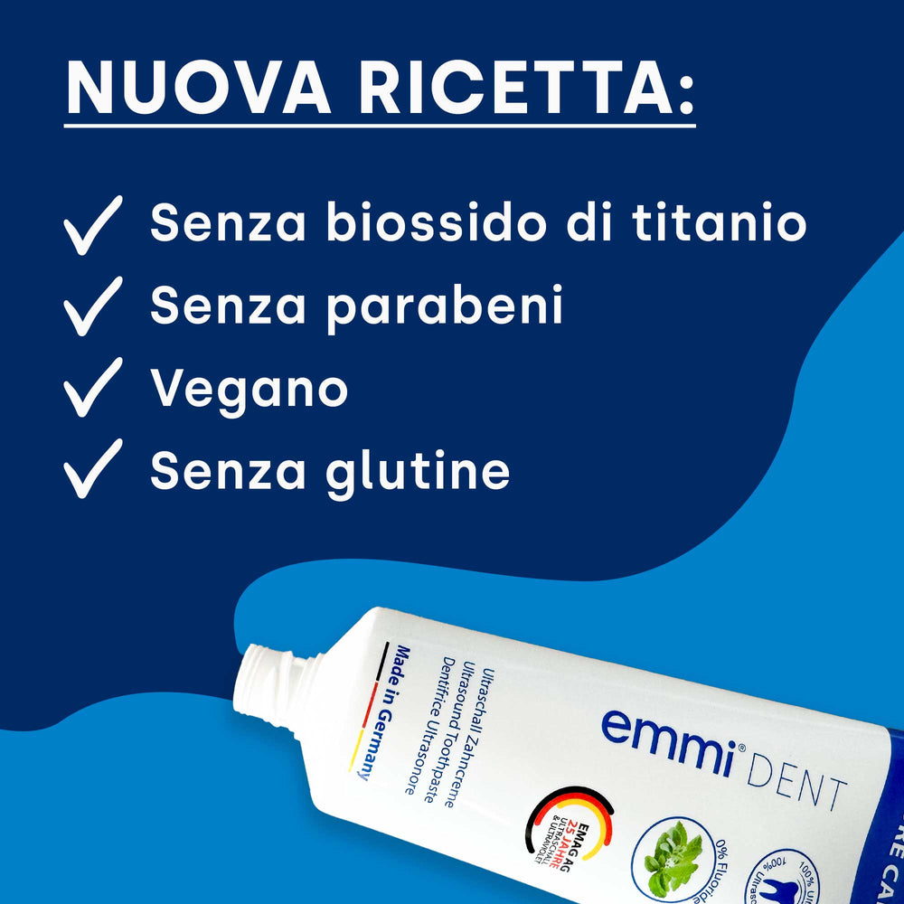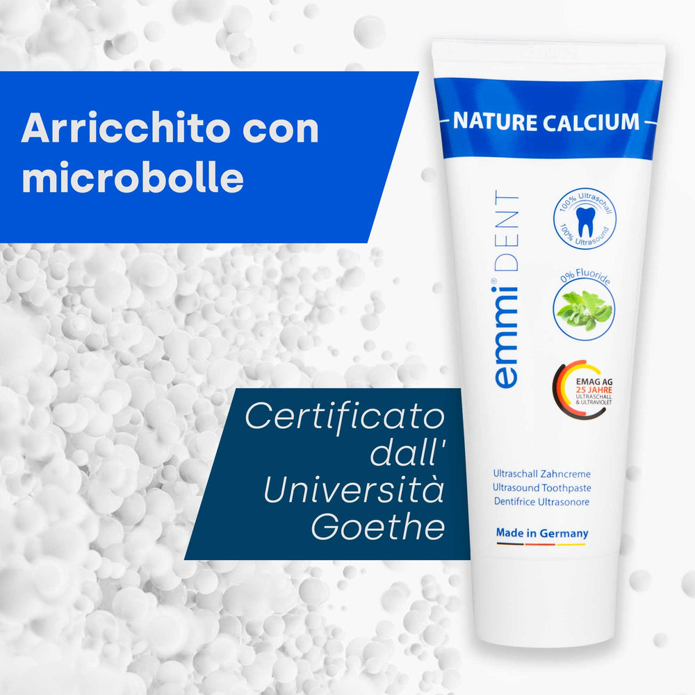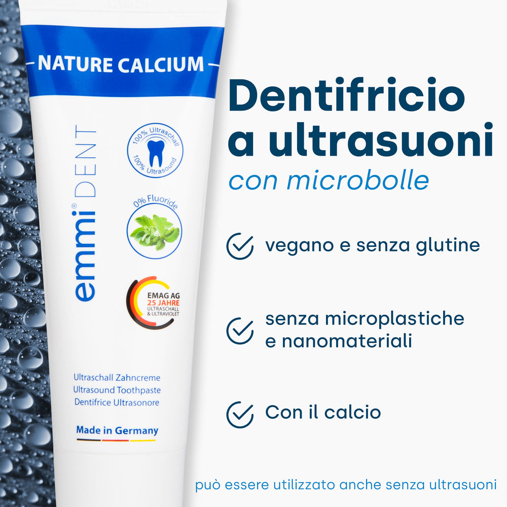 Il dentifricio emmi-dent Nature Calcium Ultrasonic ti offre una cura naturale ed efficace che pulisce delicatamente e rinforza i tuoi denti. Grazie al calcio che contiene, i tuoi denti saranno più forti e più resistenti alla carie. Scopri i benefici del dentifricio senza fluoro per un sorriso sano e forte.