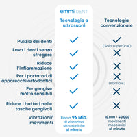 La tecnologia ad ultrasuoni ha dimostrato di essere efficace nella pulizia professionale dei denti presso il dentista. Si utilizza un ultrasuono “duro”, ovvero a bassa frequenza e ad alta potenza. Da molti anni i dentisti utilizzano con successo questo metodo per rimuovere il tartaro e altri contaminanti. Lo spazzolino ultrasonico consente anche l'uso quotidiano della tecnologia a ultrasuoni a casa. L’innovativo emmi-dent utilizza un ultrasuono “soft” ad alta frequenza e bassa potenza.