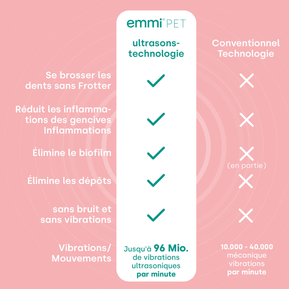L'emmi-pet 2.0 est basé sur une technologie ultrasonique brevetée (jusqu'à 96 millions de vibrations ultrasoniques par minute) et, lorsqu'il est utilisé régulièrement, prévient efficacement le tartre et réduit la plaque dentaire. Une utilisation régulière prévient non seulement la formation de plaque dentaire, mais masse et renforce également les gencives et réduit l'inflammation des gencives existante.