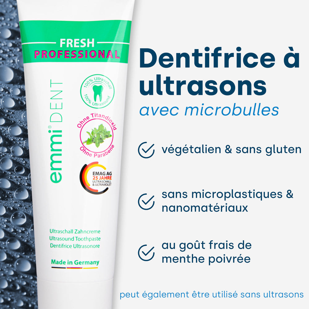 Le dentifrice emmi-dent Fresh est idéal pour les dents sensibles. Il nettoie en douceur, renforce les gencives et combat la plaque dentaire et le tartre. Avec des ingrédients naturels, il procure une haleine fraîche et une sensation de propreté grâce à la technologie révolutionnaire des ultrasons.