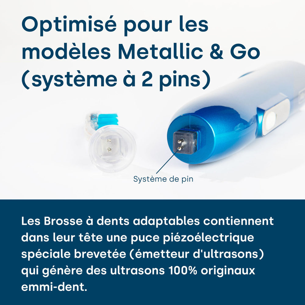 Veuillez noter que les têtes de brosse à ultrasons de l' emmi-dent Metallic & Go ne peuvent être utilisées que pour le nettoyage des dents et l'hygiène bucco-dentaire avec le modèle emmi-dent Metallic & Go .