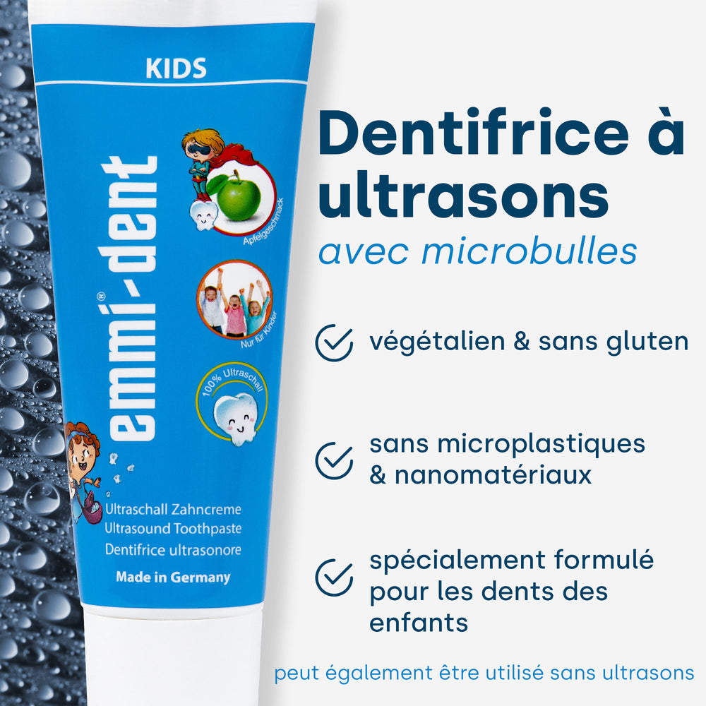 emmi-dent présente fièrement le dentifrice à ultrasons emmi-dent Kids - un produit de soins dentaires spécialement formulé pour les enfants qui est non seulement doux, mais offre également la combinaison unique de la technologie ultrasonique et des propriétés de réduction des germes. Cette description de produit révèle les caractéristiques et avantages exceptionnels de ce dentifrice spécial :