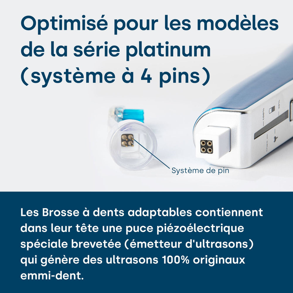Veuillez noter que les têtes de brosse à ultrasons emmi-dent Platinum ne peuvent être utilisées pour le nettoyage des dents et l'hygiène bucco-dentaire qu'avec le modèle premium emmi-dent Platinum .