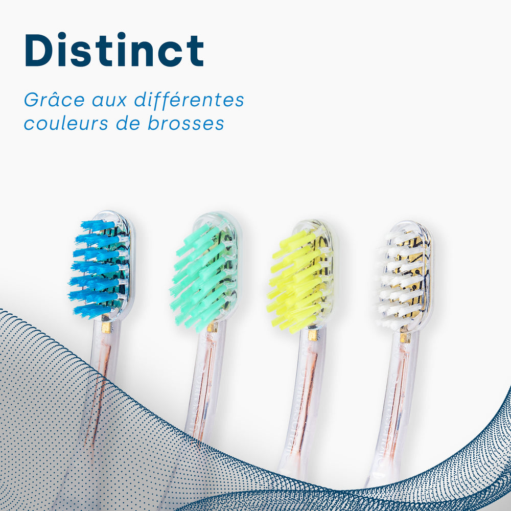Les têtes de brosse à ultrasons des brosses à dents à ultrasons emmi-dent contiennent une puce piézo spéciale brevetée (générateur d'ultrasons) dans la tête de brosse pour générer les ultrasons emmi-dent 100 % originaux. Quatre broches de contact ont été intégrées dans les bases des têtes de brosse à ultrasons emmi-dent Platinum pour la connexion à la pièce à main emmi-dent Platinum. Cette innovation évite le blocage lors du branchement et la tête de brosse à ultrasons peut être facilement branchée et retirée. De plus, grâce au timing ultrasonique optimisé, elles sont jusqu'à 4 fois plus efficaces que les têtes de brosse emmi-dent Metallic.