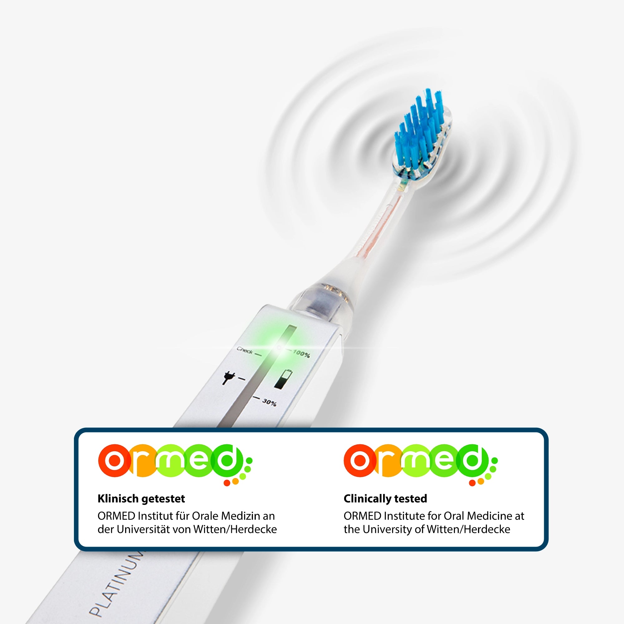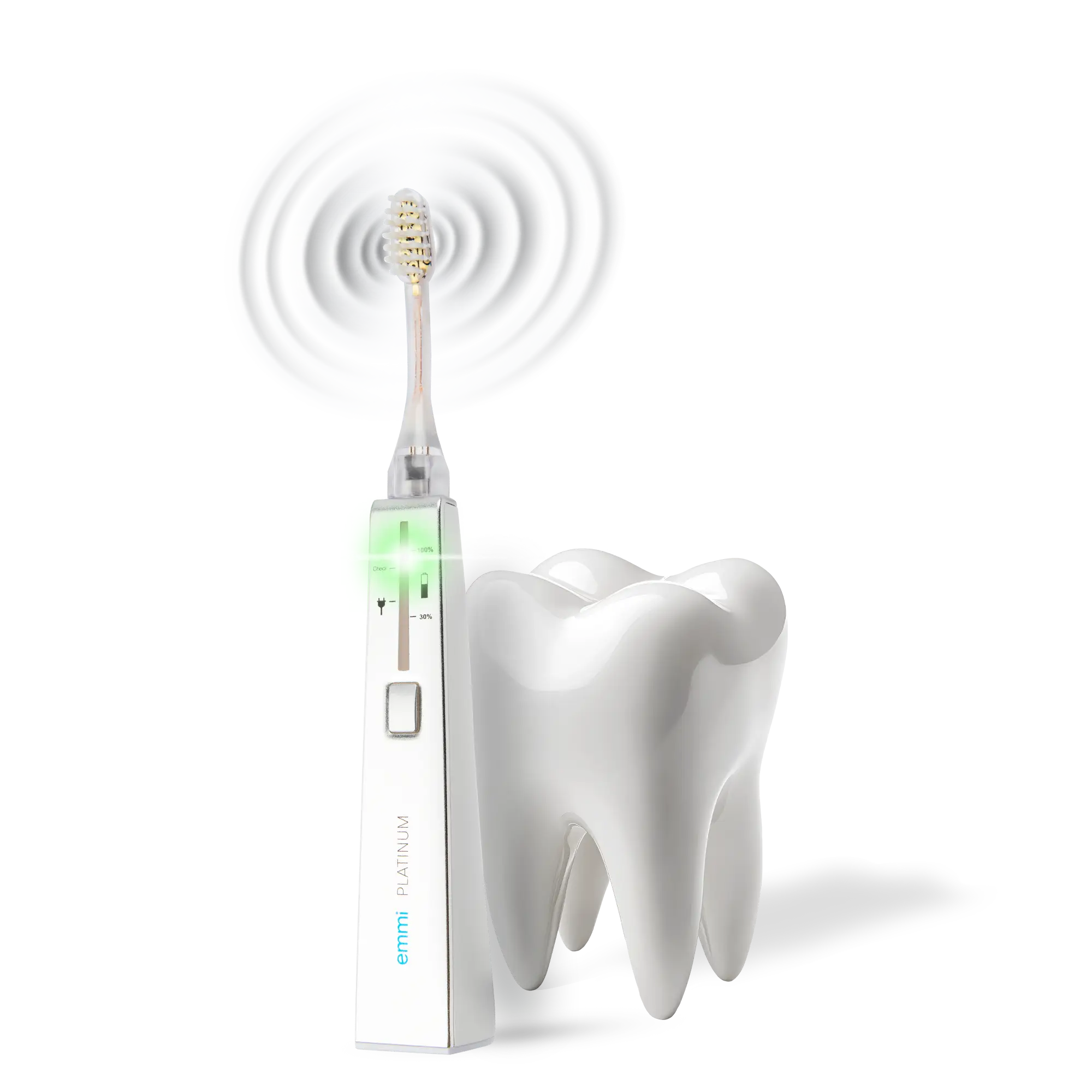La technologie des ultrasons révolutionne la façon dont vous nettoyez et prenez soin de vos dents. L'emmi-dent Platinum est la première génération de brosses à dents à ultrasons emmi-dent avec un système à 4 broches. Cela signifie que l'emmi-dent Platinum génère jusqu'à 4 impulsions ultrasonores par seconde.