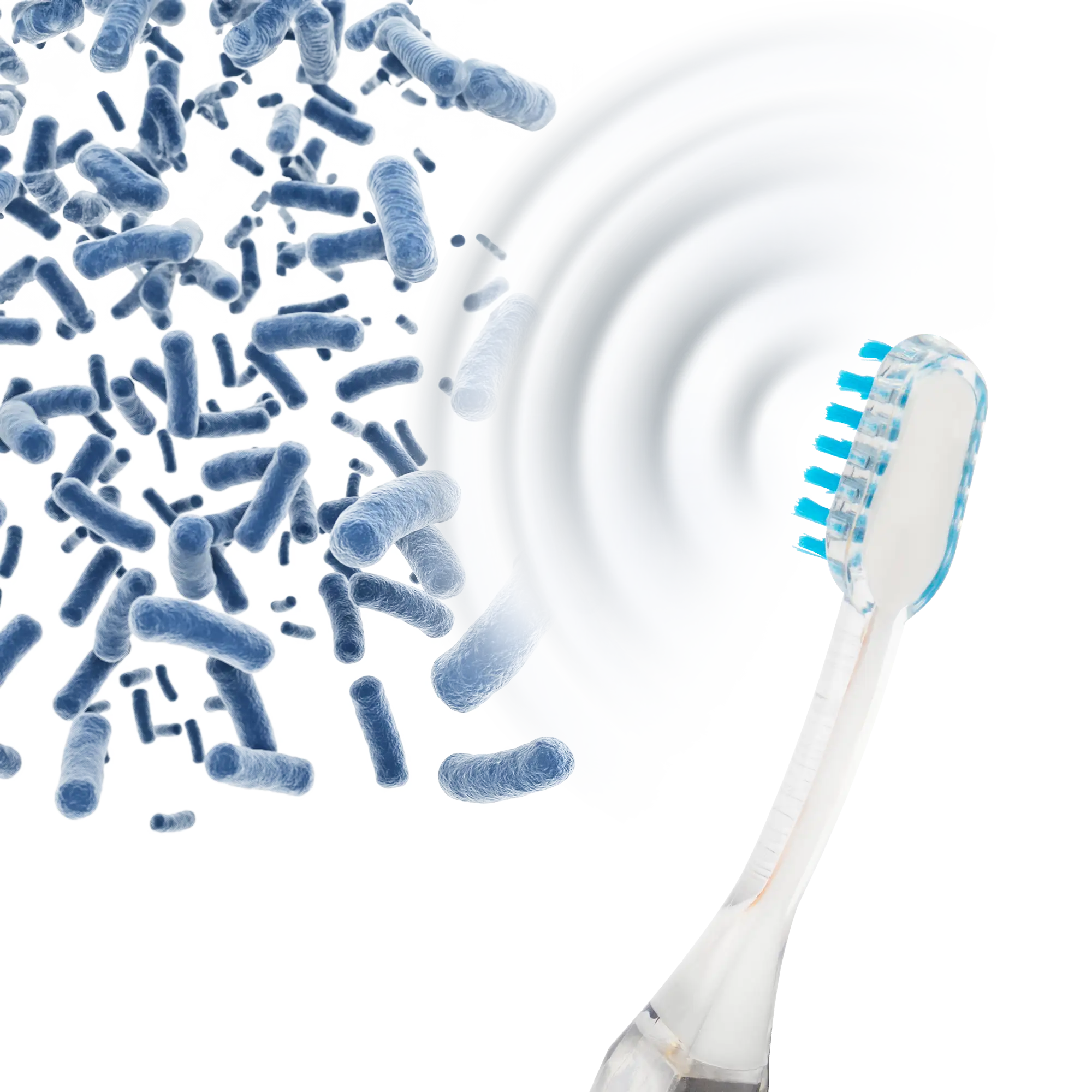 Les soins dentaires avec des brosses à dents conventionnelles se limitent aux zones de la bouche atteintes par la brosse à dents rotative ou sonique. Contrairement aux brosses à dents électriques classiques, la brosse à dents à ultrasons fonctionne totalement sans pression en transmettant des vibrations. Cela signifie que toute la cavité buccale est soigneusement nettoyée.