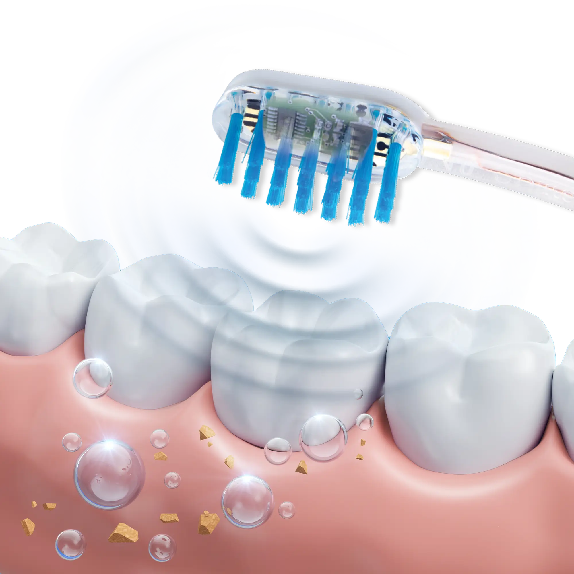 Les fines vibrations ultrasoniques pénètrent profondément dans les espaces entre les dents et les gencives, éliminant les bactéries même dans les endroits difficiles d'accès et prévenant ainsi efficacement la carie dentaire, la plaque dentaire et la gingivite. Une utilisation régulière peut réduire activement le développement de la gingivite et de la parodontite.