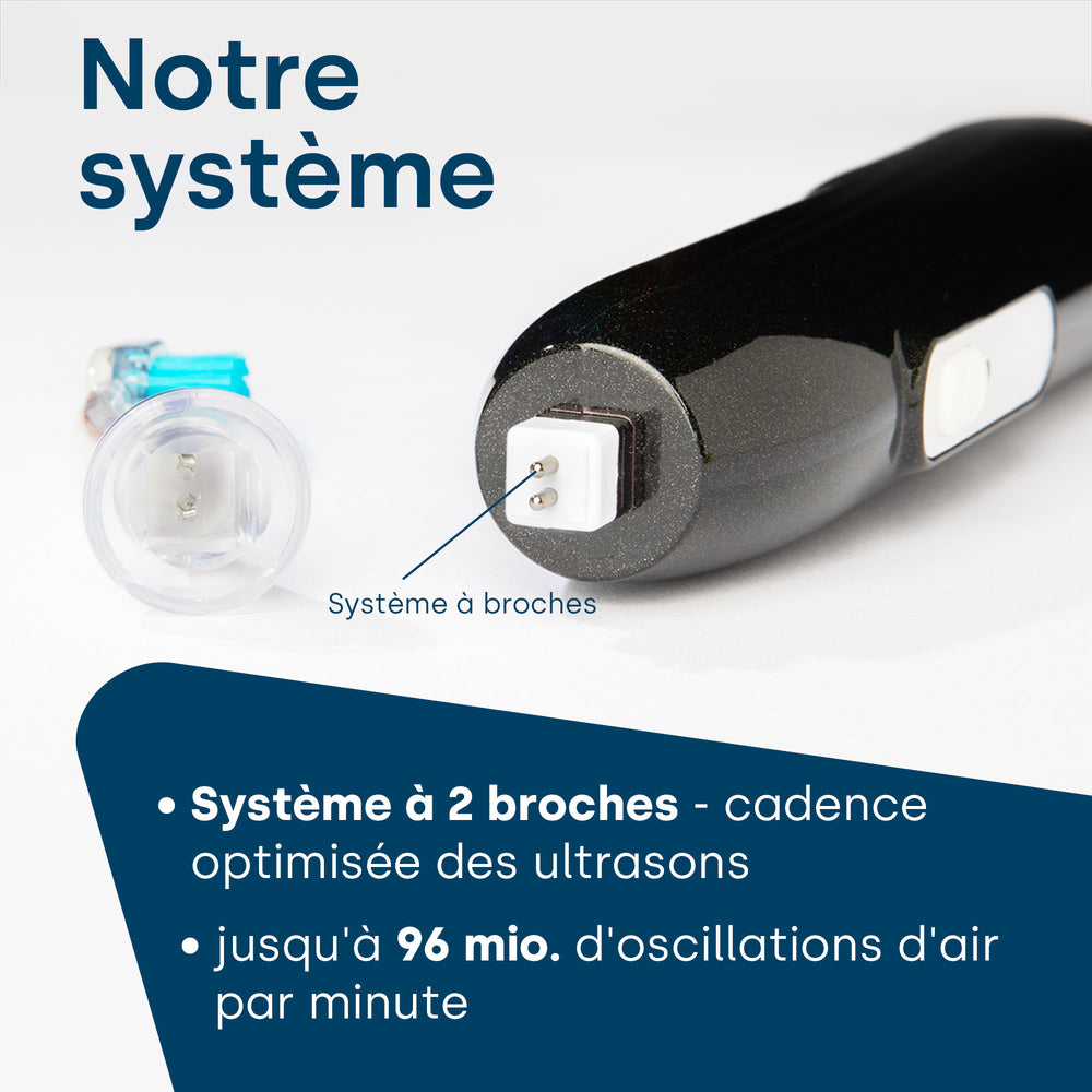 Les soins dentaires avec des brosses à dents conventionnelles se limitent aux zones de la bouche atteintes par la brosse à dents rotative ou sonique. Contrairement aux brosses à dents électriques classiques, la brosse à dents à ultrasons fonctionne totalement sans pression en transmettant des vibrations. Cela signifie que toute la cavité buccale est soigneusement nettoyée.