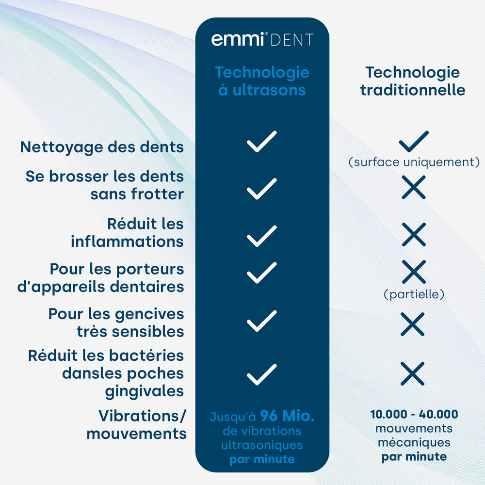 Les ondes ultrasonores pénètrent profondément dans les espaces entre les dents et la gencive. Ils y dissolvent les bactéries et la plaque dentaire, ce qui prévient efficacement la carie dentaire, la gingivite et d’autres maladies dentaires. Pour des résultats particulièrement approfondis, le dentifrice à ultrasons emmi-dent spécialement développé est utilisé. Les microbulles incluses renforcent considérablement l'effet des ultrasons.