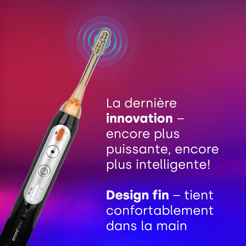 L'emmi-dent Slim établit de nouvelles normes en matière de soins dentaires. Grâce à sa technologie à ultrasons avancée et à sa conception fine, il assure un nettoyage particulièrement approfondi et doux des dents et des gencives, sans aucun mouvement mécanique.