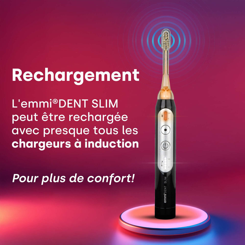 Avec une autonomie impressionnante allant jusqu'à 15 jours lorsqu'elle est utilisée deux fois par jour, l'emmi-dent Slim impressionne, éliminant le besoin de charge fréquente. Un indicateur de charge de batterie pratique vous indique toujours l'état de charge actuel et, grâce à la compatibilité avec presque tous les chargeurs à induction, la charge est particulièrement simple.
