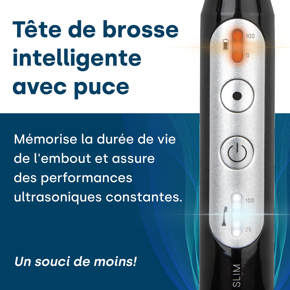 Avec jusqu'à 96 millions de vibrations multifréquences par minute, l'emmi-dent Slim réduit la plaque dentaire et les bactéries même dans les endroits difficiles d'accès. Grâce à 3 modes de nettoyage – doux, moyen et fort – la brosse à dents s’adapte parfaitement à votre santé dentaire. Le système intelligent assure une transmission optimale des ultrasons et communique intelligemment avec la tête de brosse. De plus, la tête de brosse intelligente vous rappelle de changer l'accessoire à temps et l'indicateur de charge de la batterie vous informe toujours de l'état de charge actuel.