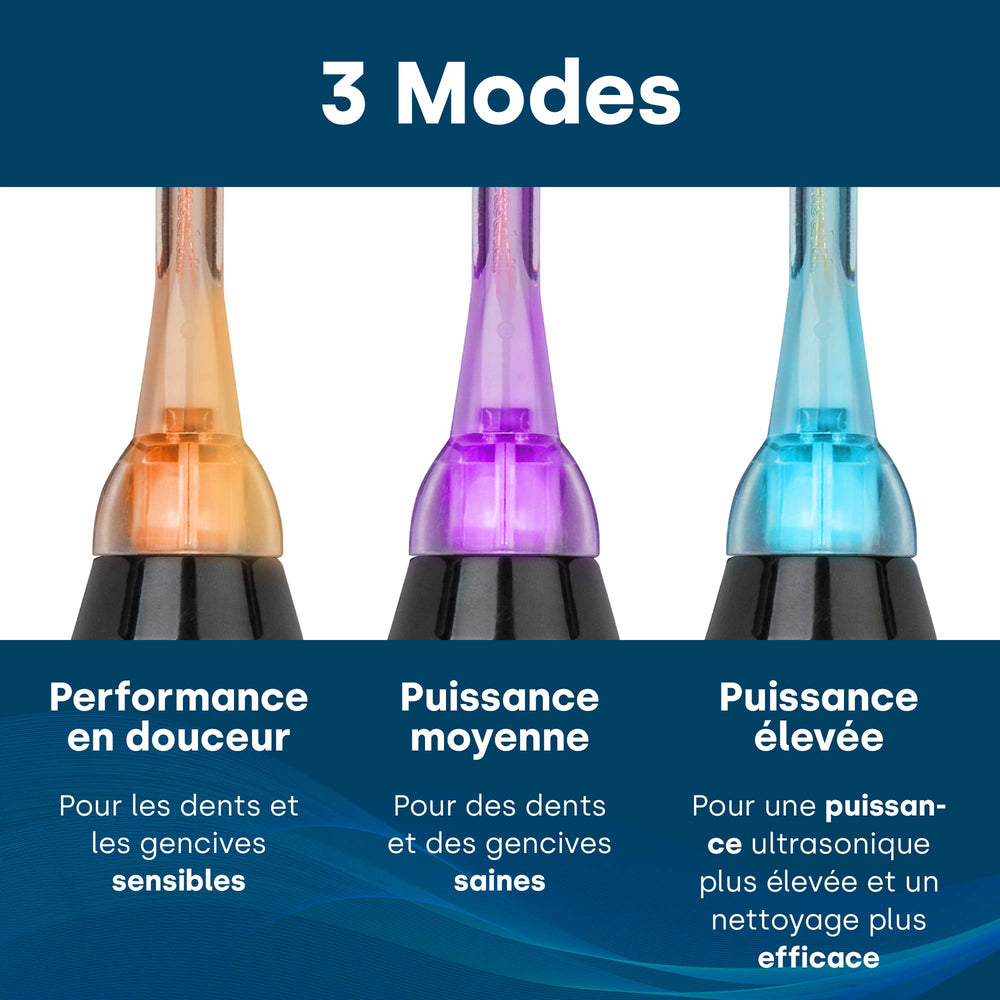 Les brosses à dents fonctionnant aux ultrasons révolutionnent le brossage des dents depuis 2013. L'avantage décisif par rapport aux brosses à dents manuelles classiques ou aux brosses à dents électriques est que les brosses à dents à ultrasons fonctionnent presque sans contact et sans mouvements mécaniques. Cela rend le nettoyage particulièrement doux et pourtant fiable et approfondi.