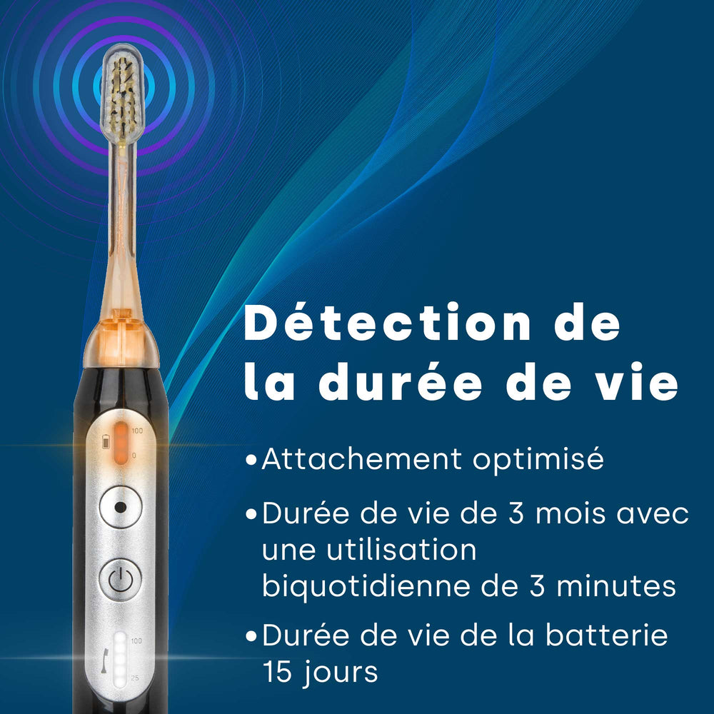 Les brosses à dents fonctionnant aux ultrasons révolutionnent le brossage des dents depuis 2013. L'avantage décisif par rapport aux brosses à dents manuelles classiques ou aux brosses à dents électriques est que les brosses à dents à ultrasons fonctionnent presque sans contact et sans mouvements mécaniques. Cela rend le nettoyage particulièrement doux et pourtant fiable et approfondi.