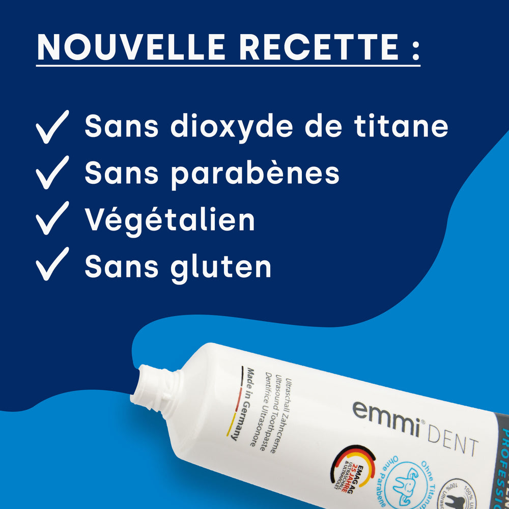 Découvrez le monde amélioré du dentifrice blanchissant emmi-dent – ​​désormais sans dioxyde de titane et sans parabène ! Découvrez le même effet blanchissant puissant, mais avec une formule encore plus naturelle. L'absence de dioxyde de titane rend notre dentifrice doux et délicat, parfait pour des dents blanches étincelantes sans compromis. Profitez du meilleur des soins dentaires naturels et d'un sourire radieux !