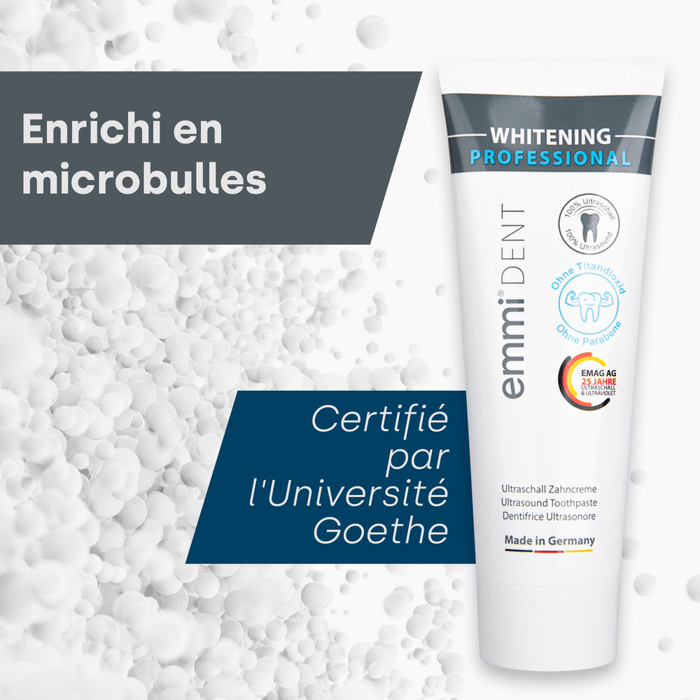 Faites confiance à l’expertise d’ emmi-dent , premier fournisseur mondial de soins dentaires par ultrasons. Notre dentifrice blanchissant à ultrasons a été développé par des experts et testé cliniquement pour vous offrir une qualité exceptionnelle et une technologie innovante. Choisissez emmi-dent et vivez la différence !